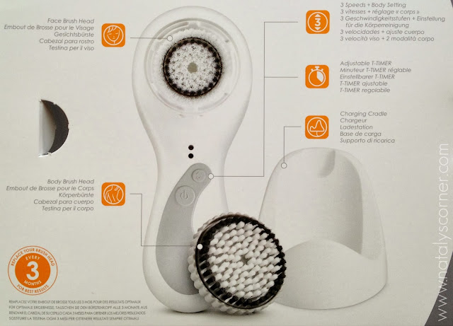Junto con el aparato y los dos cabezales, vienen en la caja dos mini-tallas de una limpiadora facial y un exfoliante corporal de la marca Clarisonic.